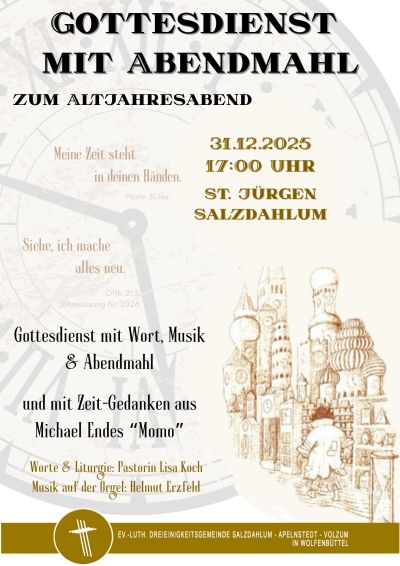 Am 31. Dezember 2025 um 17:00 Uhr lädt die Dreieinigkeitsgemeinde SAV in der Kirche St. Jürgen in Salzdahlum zu einem besonderen Gottesdienst mit Abendmahl am Altjahresabend ein: Mit Michael Endes Romanfigur "Momo" wollen wir in Wort, Musik & Abendmahl dem Geheimnis der Zeit nachspüren und unter Gottes Segen den Schritt vom alten ins neue Jahr wagen. Liturgie, Worte & Gedanken kommen von Pastorin Lisa Koch, Helmut Erzfeld trägt Musik und Choralbegleitung auf der Orgel bei.